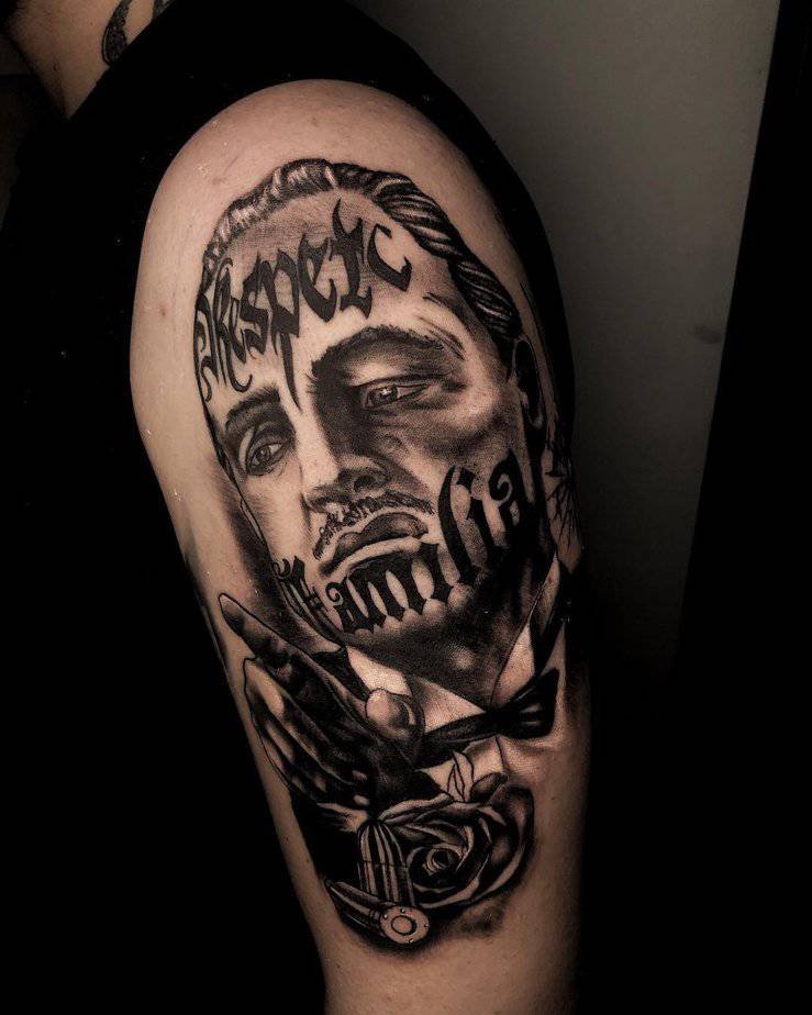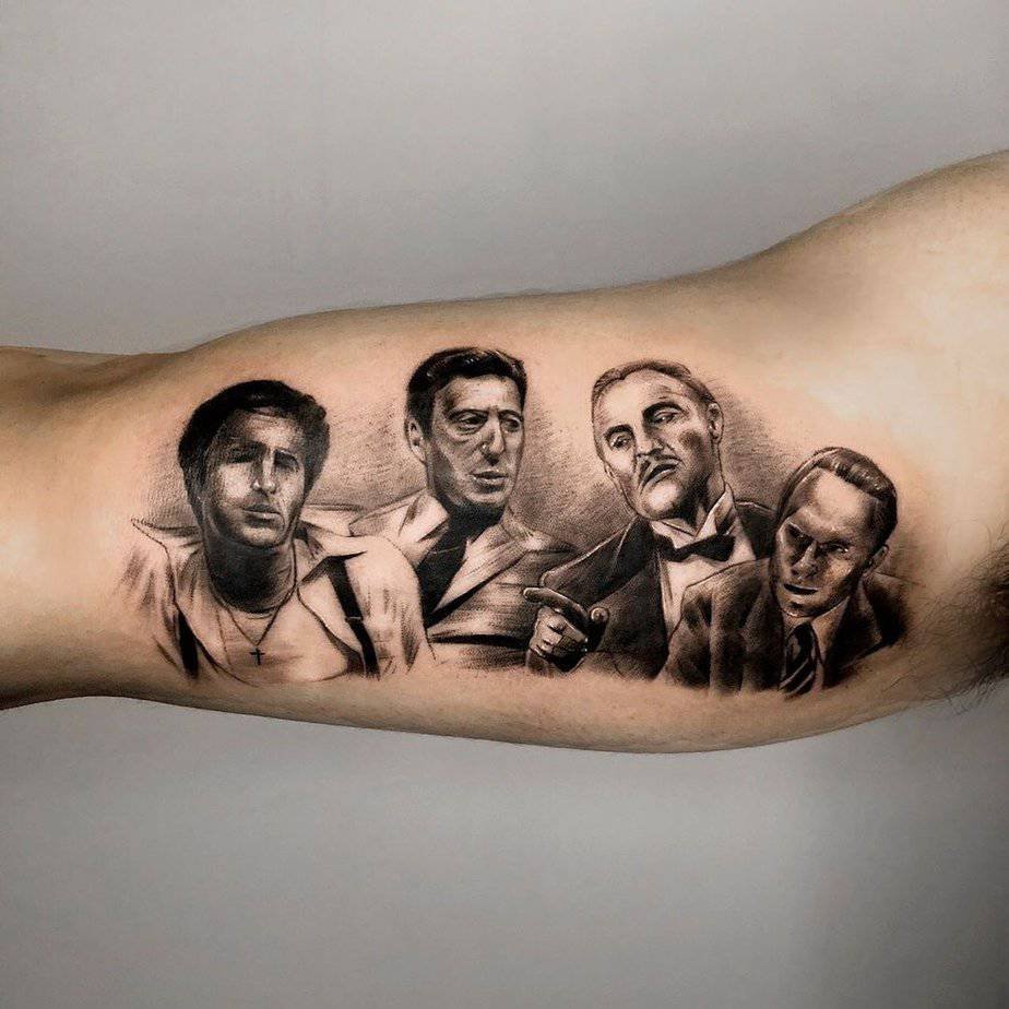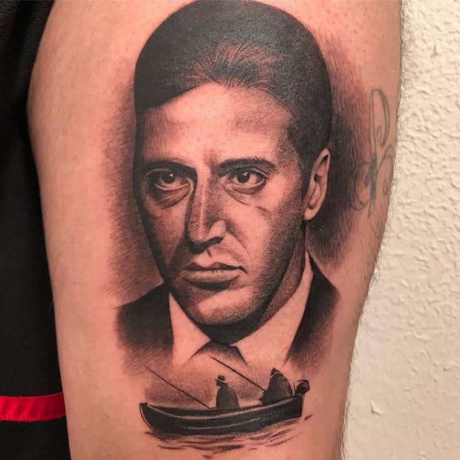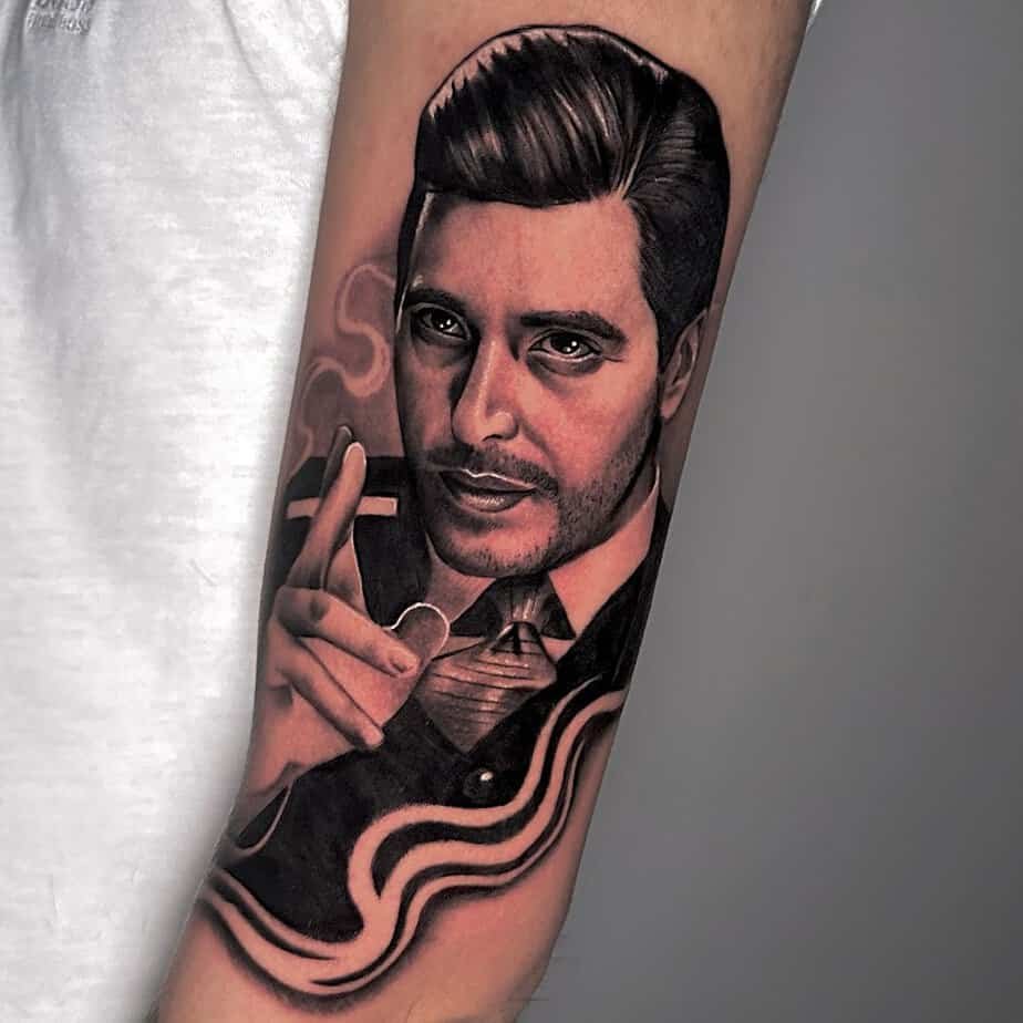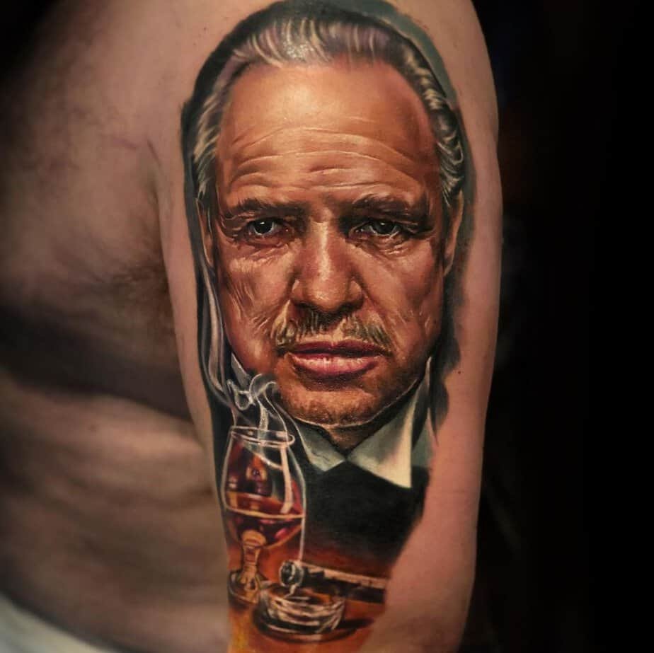 This is the kind of tattoo that feels like it’s guarding you. Don Vito’s pensive, commanding face in dark, detailed shading—perfect if you want the Godfather literally watching your back.