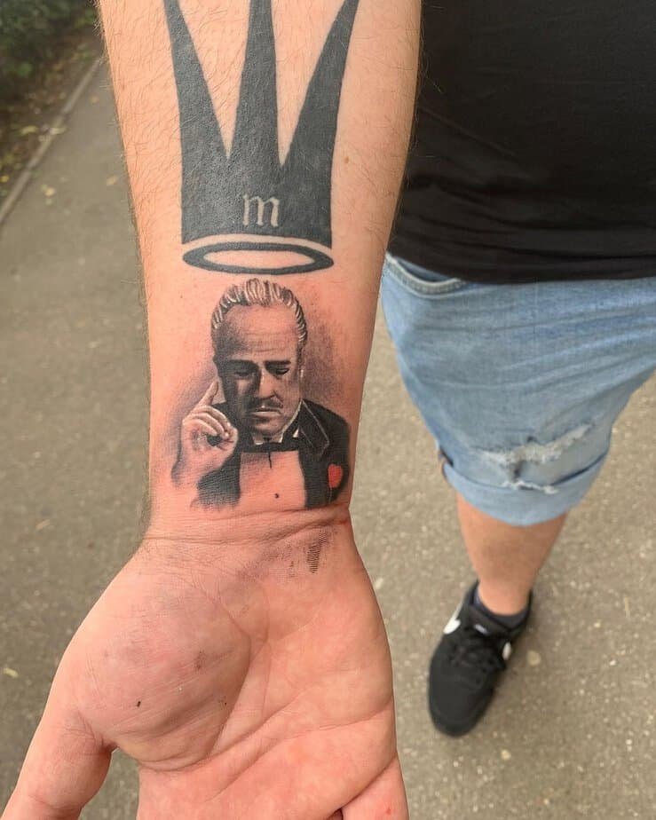 A wrist-sized Don Vito under a crown is a playful yet regal nod to his status. Small, clever placement that says a lot with very little.
