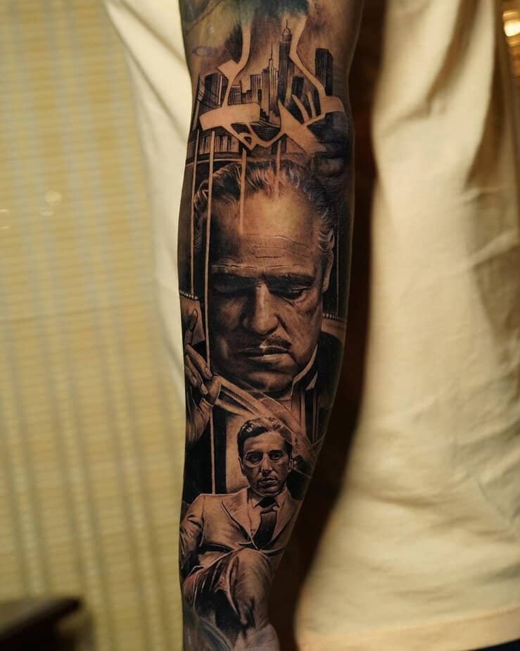 This forearm piece layers cityscapes and figures to show how the family holds sway over the streets. It’s dynamic, detailed, and tells a whole story from elbow to wrist.
