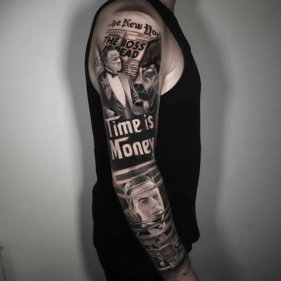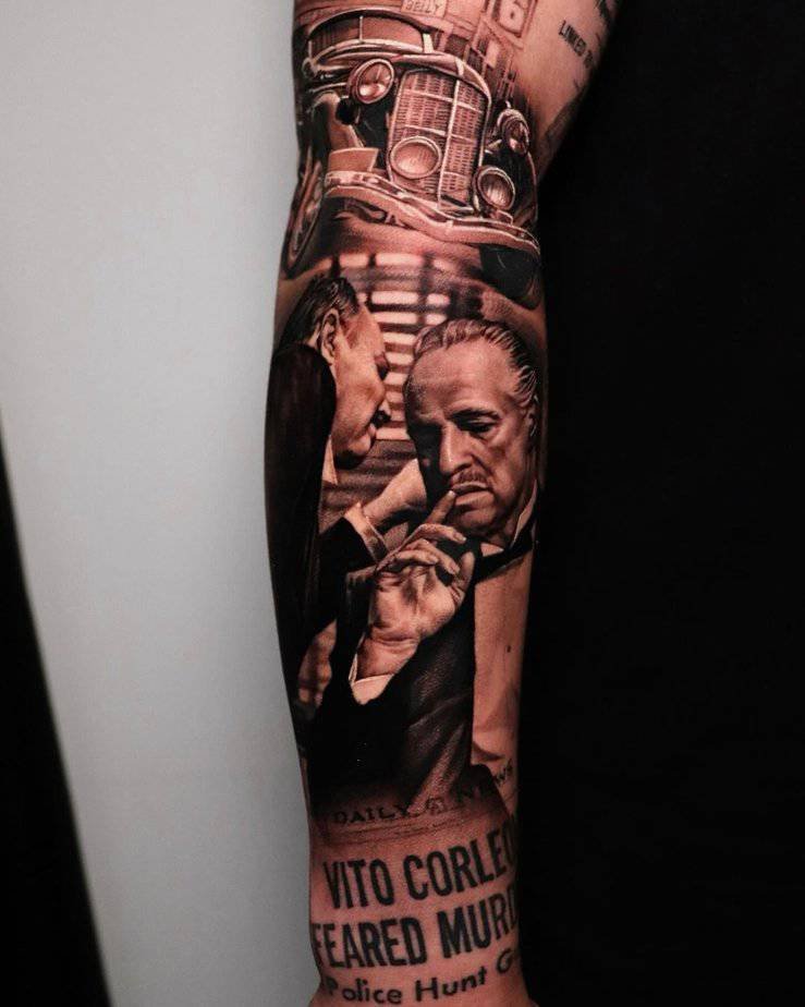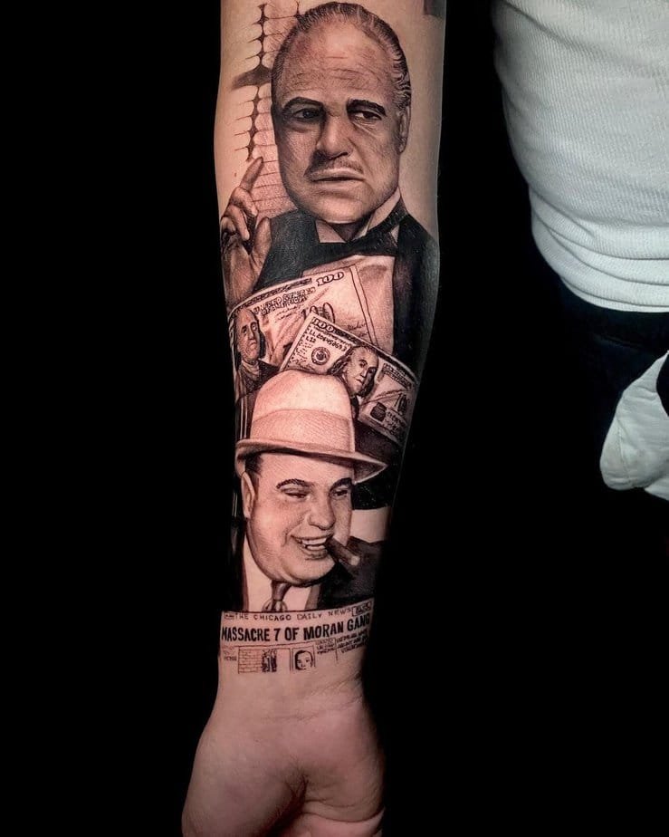 Combining Don Vito and Al Capone is such a flex—vintage newspaper, dollar bills, the whole nostalgia mafia vibe. It’s a nod to both fiction and history, layered into one intricate forearm piece.