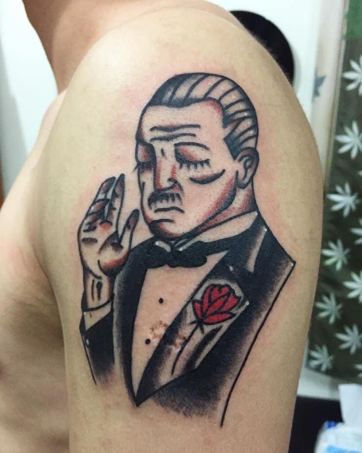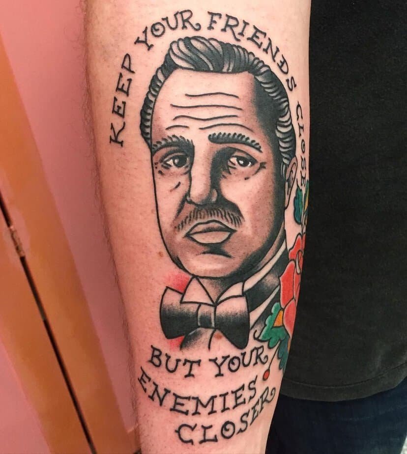 Traditional tattoo styling plus Don Vito equals nostalgia with gravitas. It’s classic flash meets mob movie royalty.