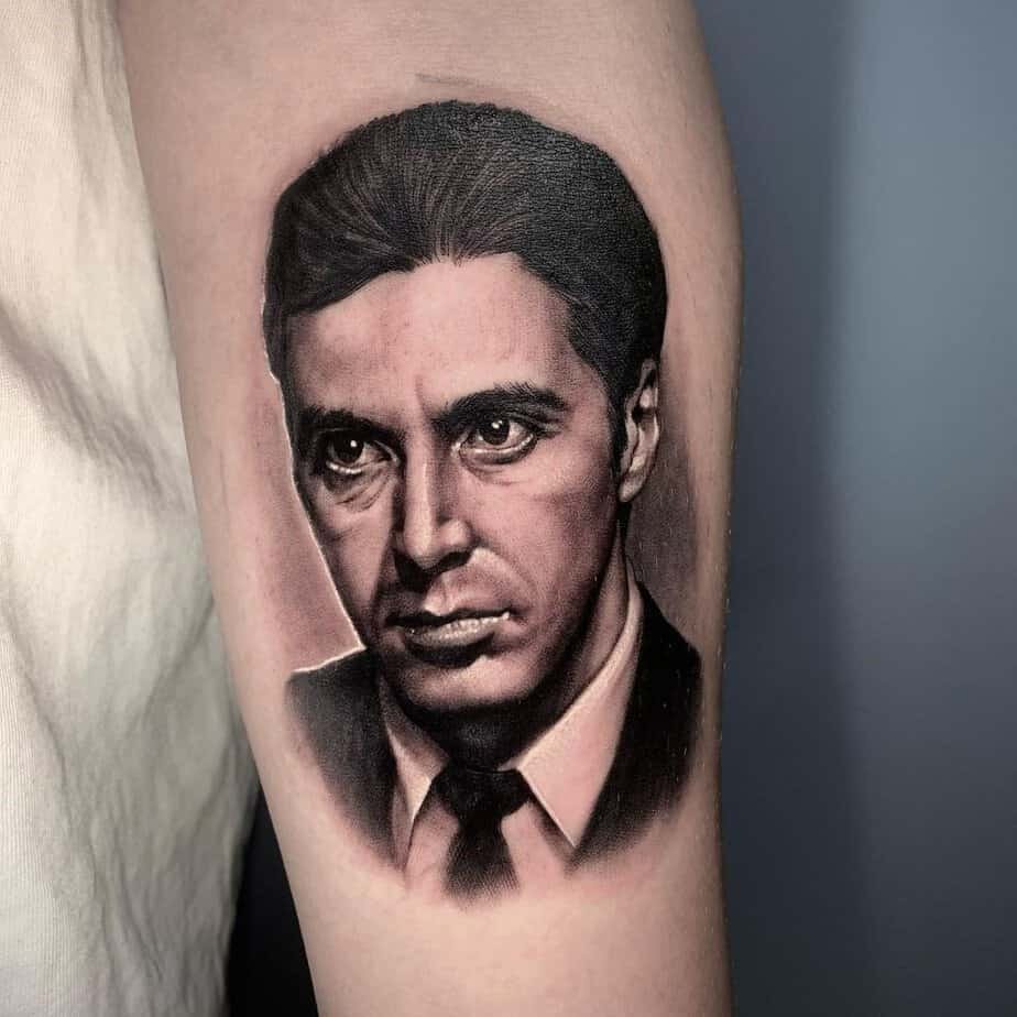 Michael’s gaze is one of those looks that makes you feel small—this tattoo captures that cold, calculating stare with meticulous dot work and shading. It’s a statement piece.