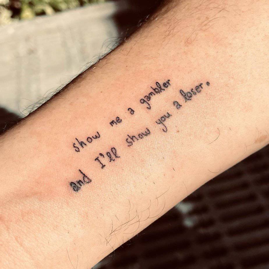 Minimalist text tattoos with lines like “Show me a gambler and I'll show you a loser” are clever and punchy. They’re small, meaningful, and quietly sharp.