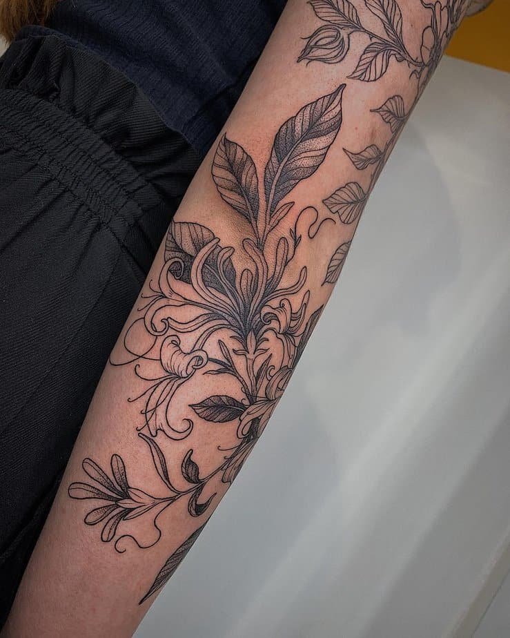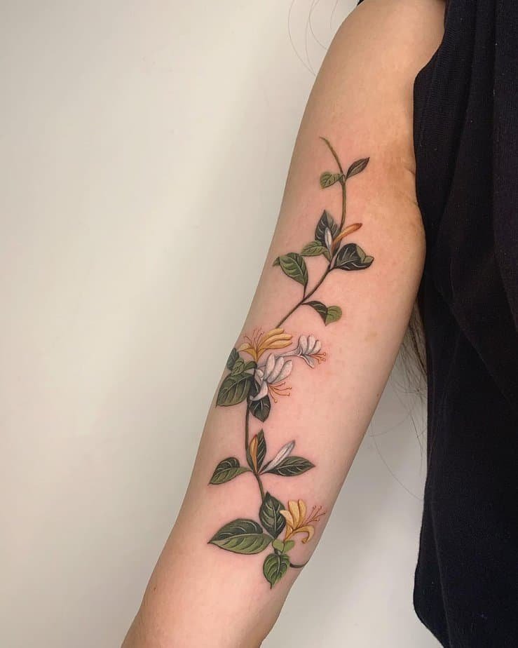 Dotwork gives a piece this soft, textured vibe that’s unexpectedly intimate. Paired with black and gray, an upper-arm honeysuckle done this way looks delicate but thoughtful. It also nods to the idea of different elements coming together — tiny dots forming a whole — which makes it a lovely choice if you want a tattoo about connection and unity.