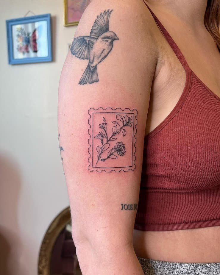 A stamped honeysuckle is such a creative take — black-and-gray gives it an almost print-like quality. It reads like a little badge that says, “Don’t forget to notice beauty.” Perfect for someone who likes their tattoos to feel artistic and subtle.