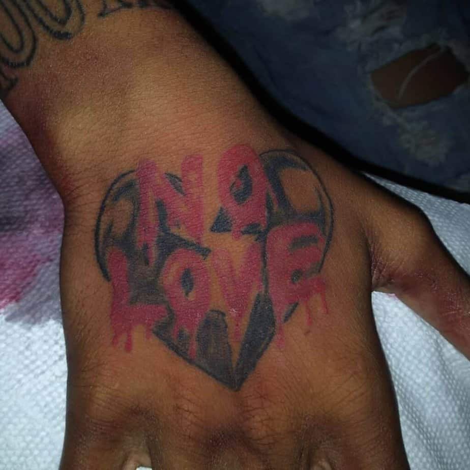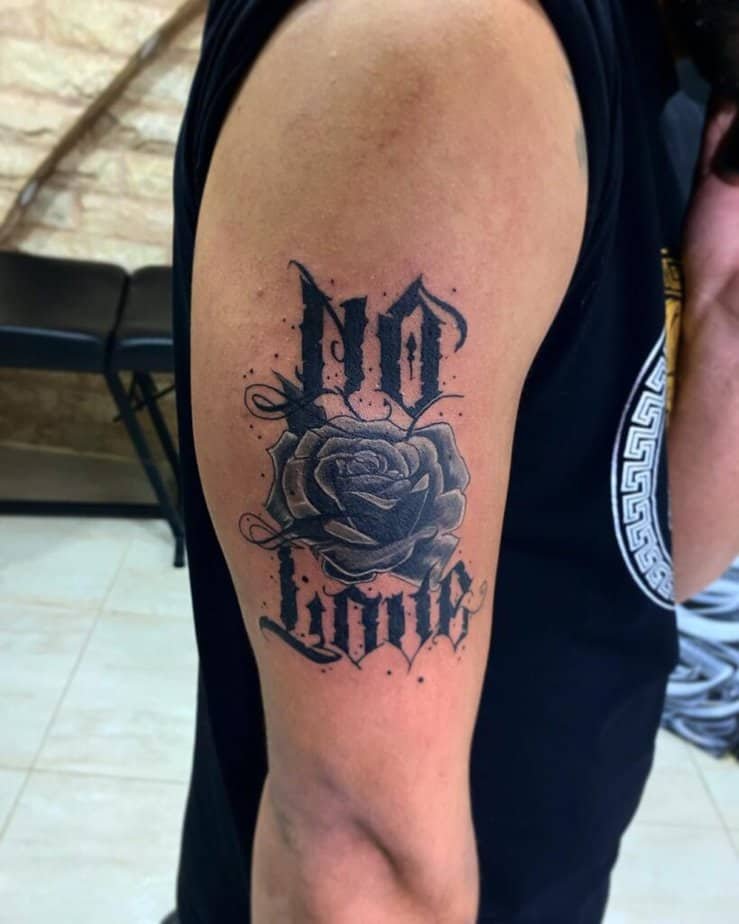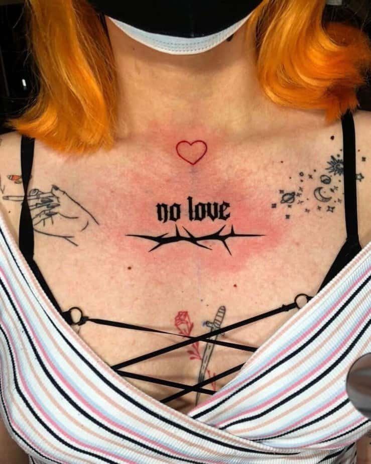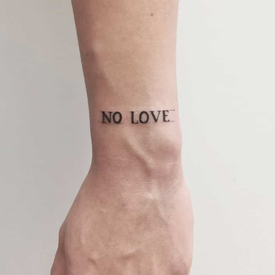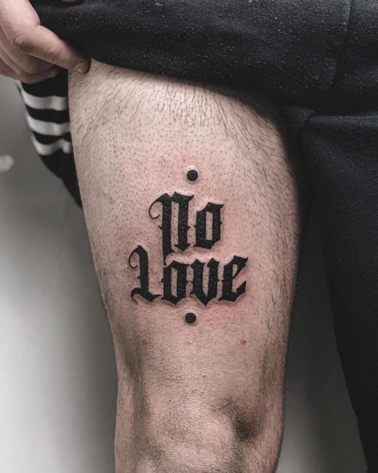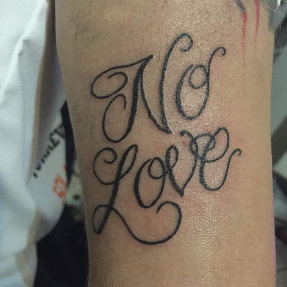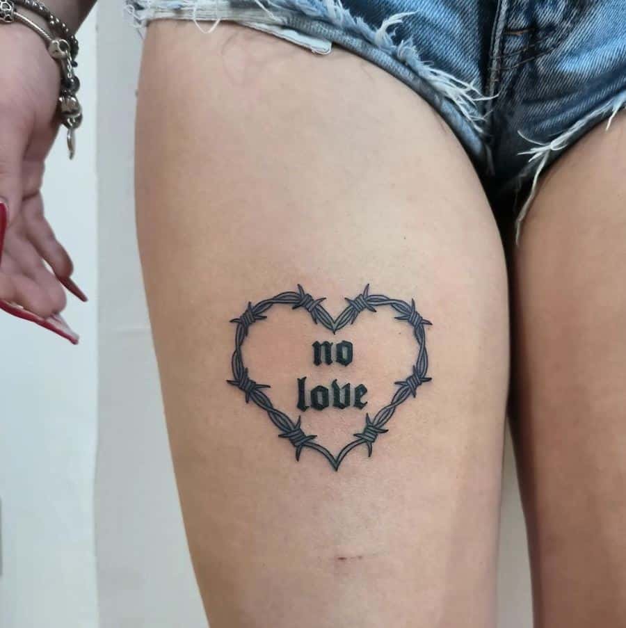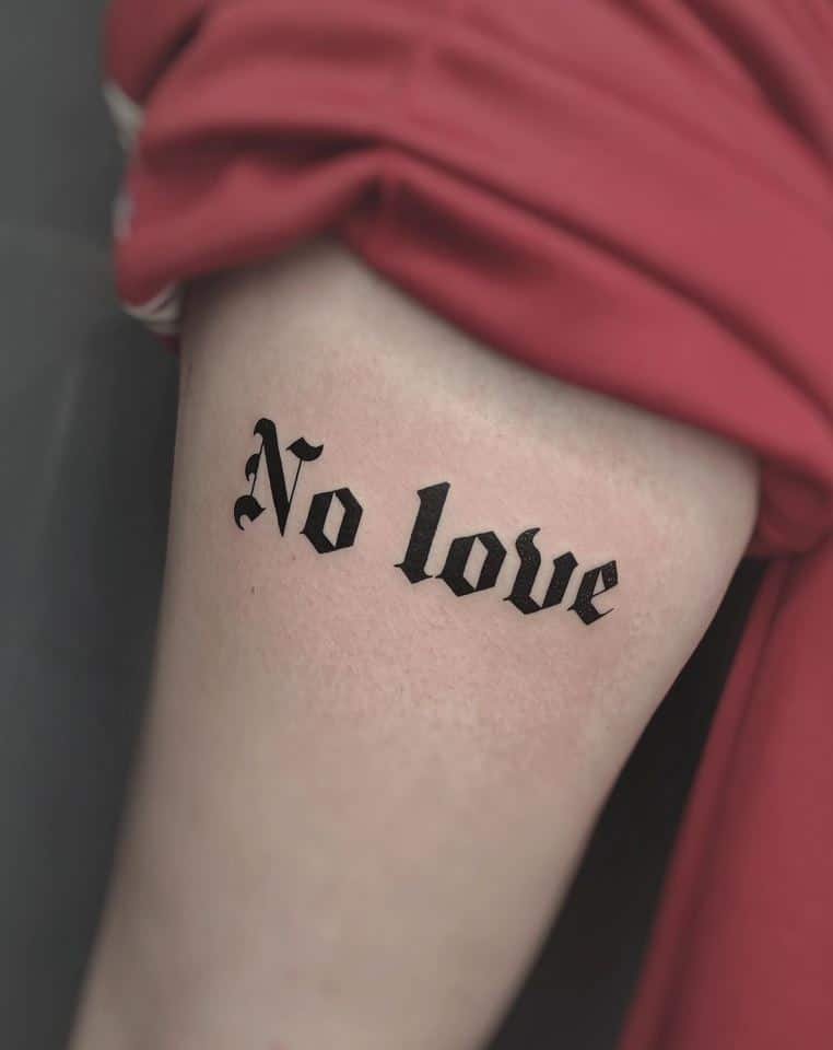 A stomach tattoo can be intimate and bold in turns. The “no love” phrase fits nicely here, especially if you want something that feels like a personal declaration rather than a billboard.