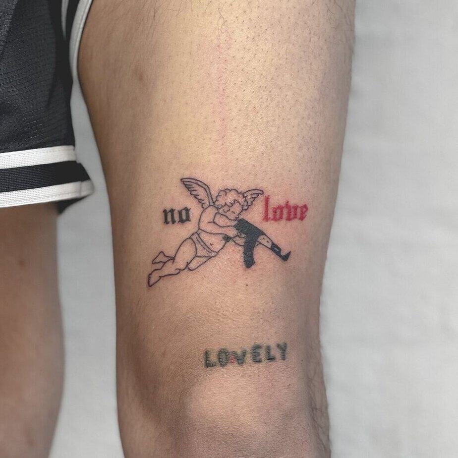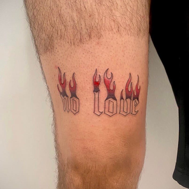 Leg tattoos give you room to play. You can go whimsical — like a baby angel holding a gun surrounded by “no love” — or stick with bold, graphic letters that feel almost like a poster. Flames, bright colors, and wired symmetrical hearts filled with the phrase are all great choices if you want something eye-catching. Perfectionists, take note: there are designs here that practically beg to be mirrored.