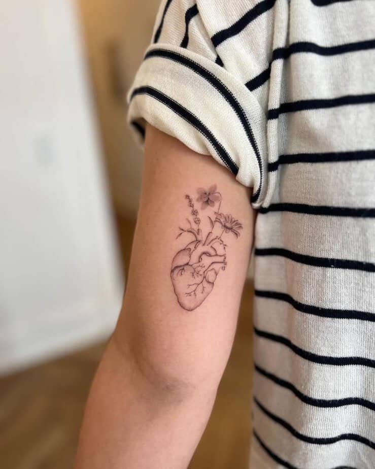 A human heart with flowers growing from it — talk about symbolism. It reads as growth, healing, and the idea that tending to your inner life lets beauty bloom. Personal growth in ink form; tender and hopeful.