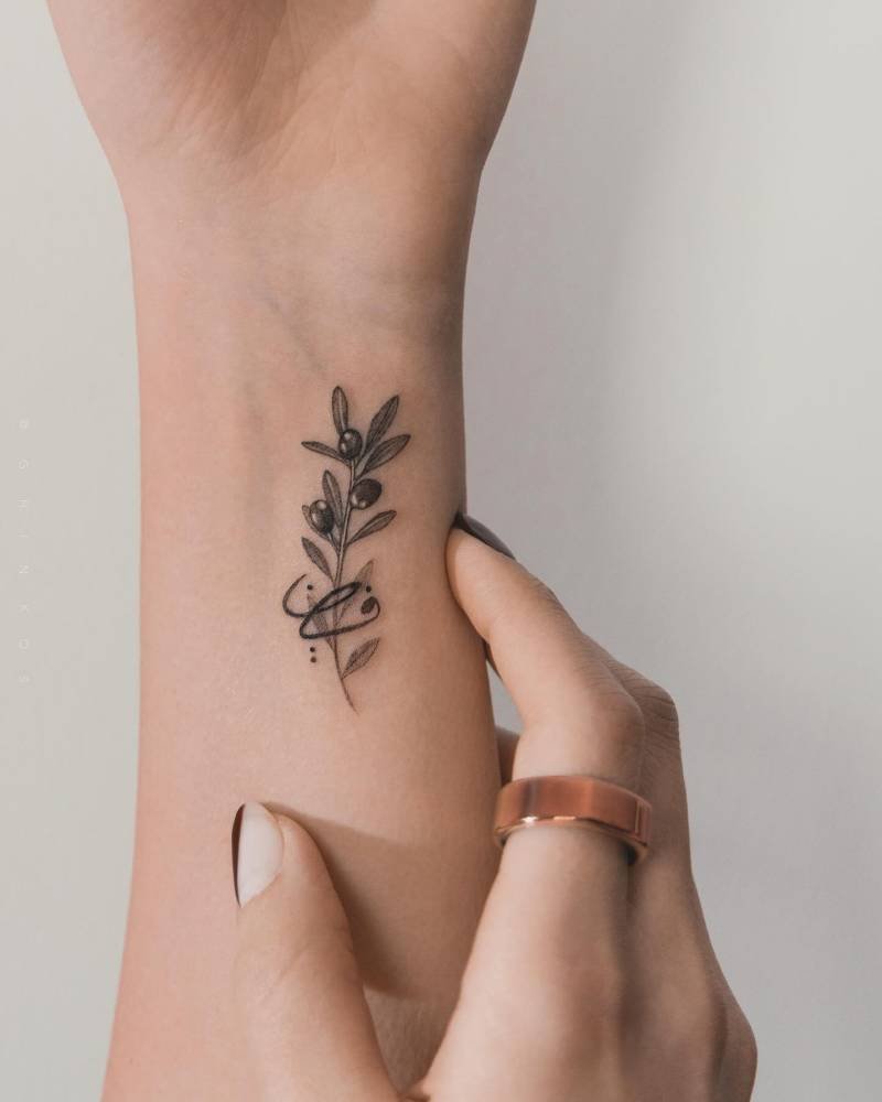 A wrist tattoo of an olive branch — soft, simple, and quietly meaningful. It leans into peace, healing, and cleansing; small but constant, a daily nudge to choose harmony. Perfect if you want something minimal that still carries a whole sentence of meaning.