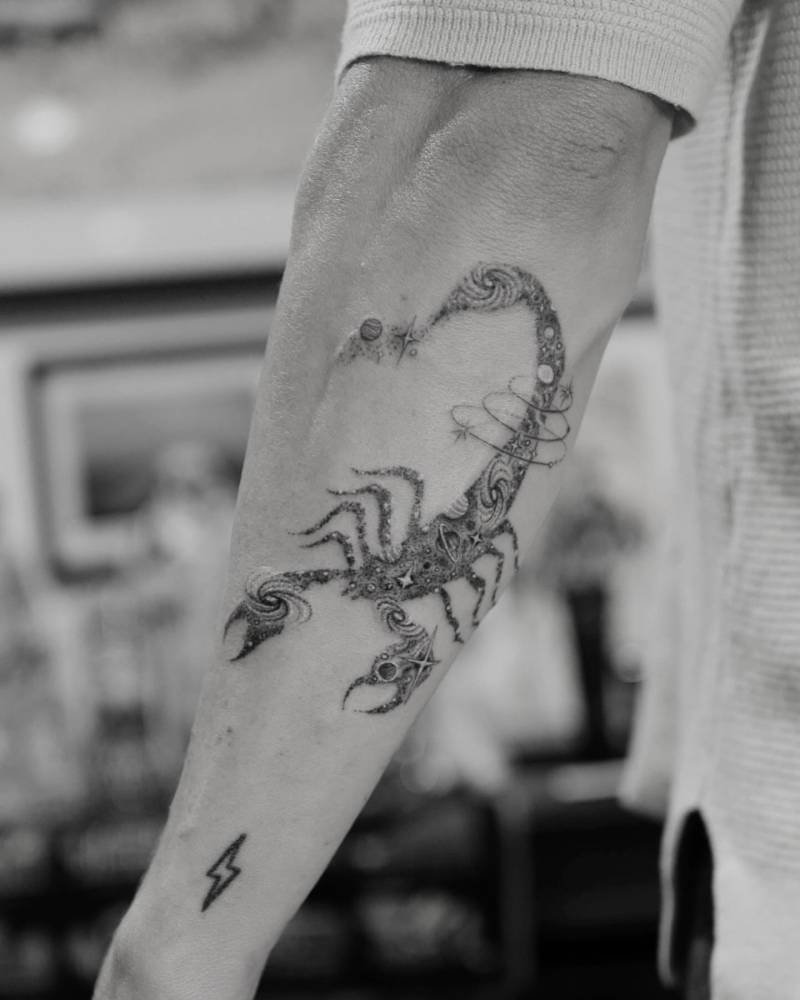 This forearm piece turns a scorpion into a little cosmos — stardust, comets, tiny planets all forming its body. It’s a rad mix of astrological grit and celestial beauty, nodding to resilience and growth. If you like tattoos that blend personality with a broader sense of wonder, this one’s a showstopper.
