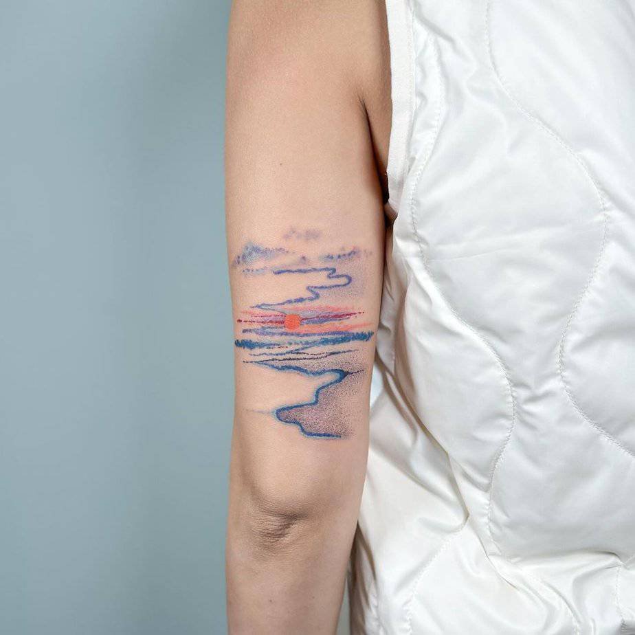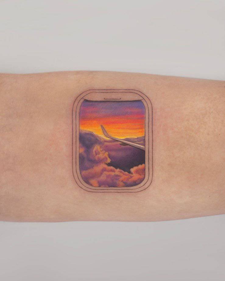 Picture a little tattoo that looks like an airplane window swung open to a sunset — you can see the wing and clouds painted in yellows, pinks, purples and oranges. The colors melt into each other so nicely it almost feels like a tiny portal to wanderlust. Every time you glance at it, you get that same soft nudge: go somewhere, or at least sit and dream about it.