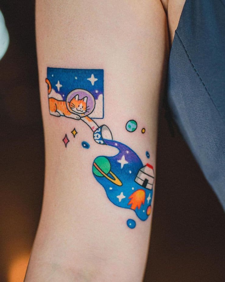 An orange kitty in an astronaut helmet knocks over a bowl and spills out stars, rockets, and planets — I mean, who doesn’t smile at that? It’s playful, curious, and a little nostalgic, like a childhood story about exploring the cosmos with a furry friend.