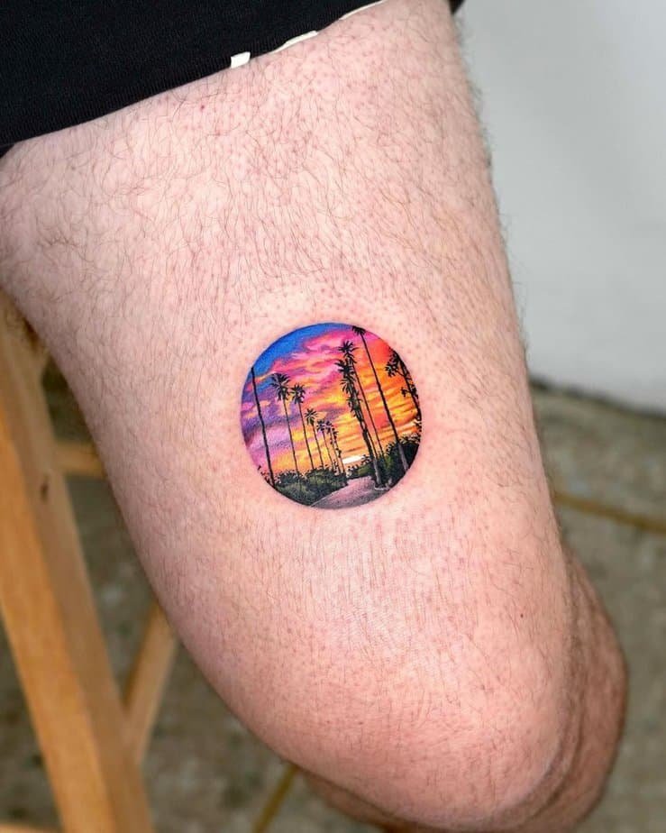 A little circle on the leg that captures a Malibu-ish golden hour — palm silhouettes, warm glow, that lazy vacation vibe. It’s all about freedom and joy, a small reminder to soak up the good times (and the sunsets) even when life gets busy.