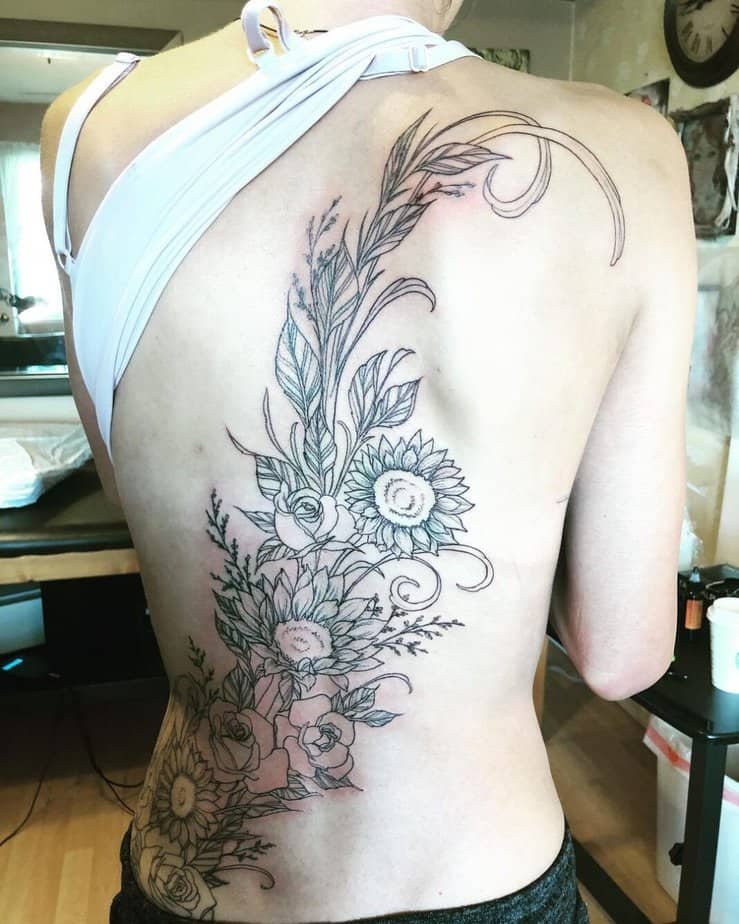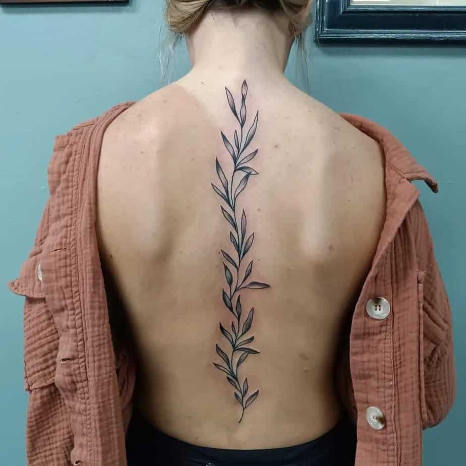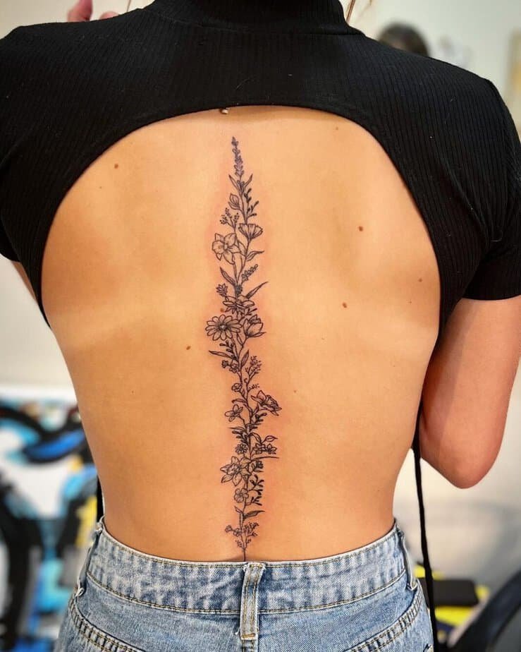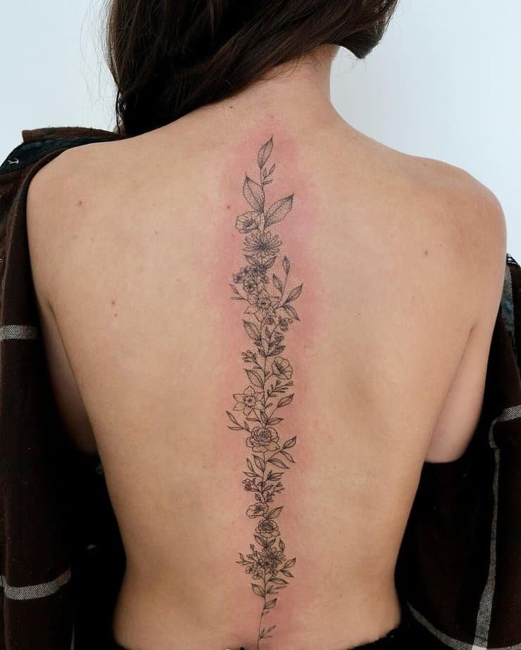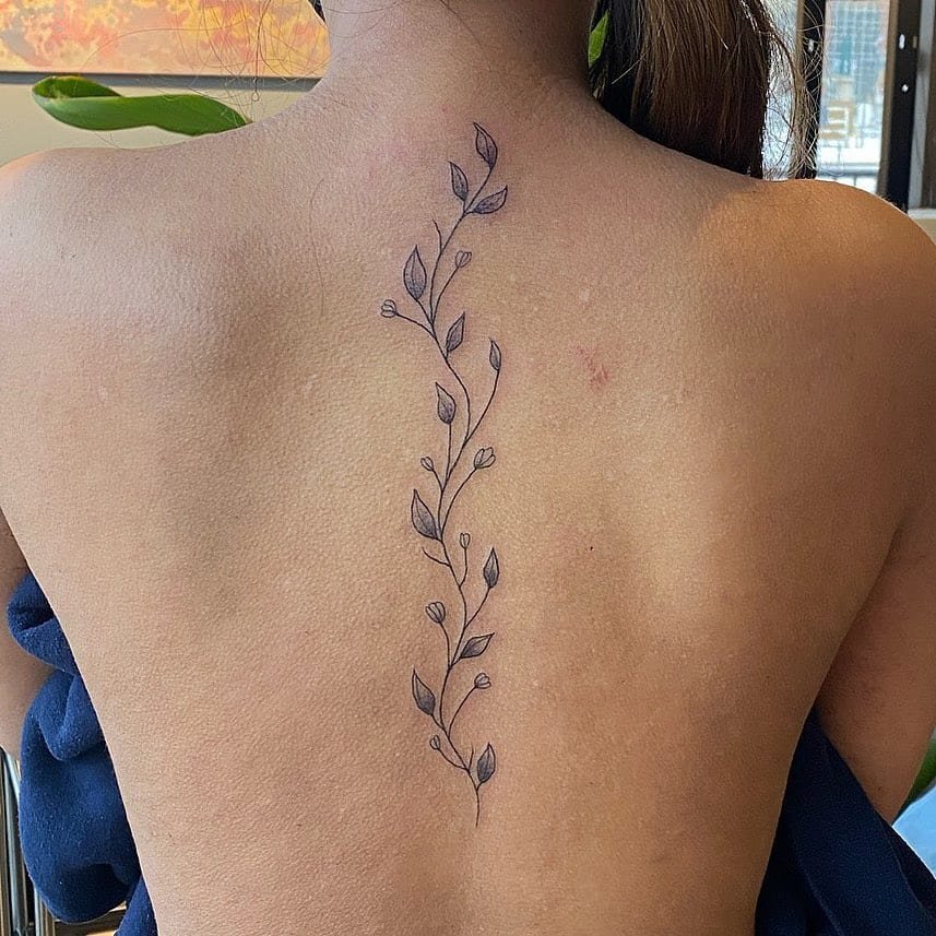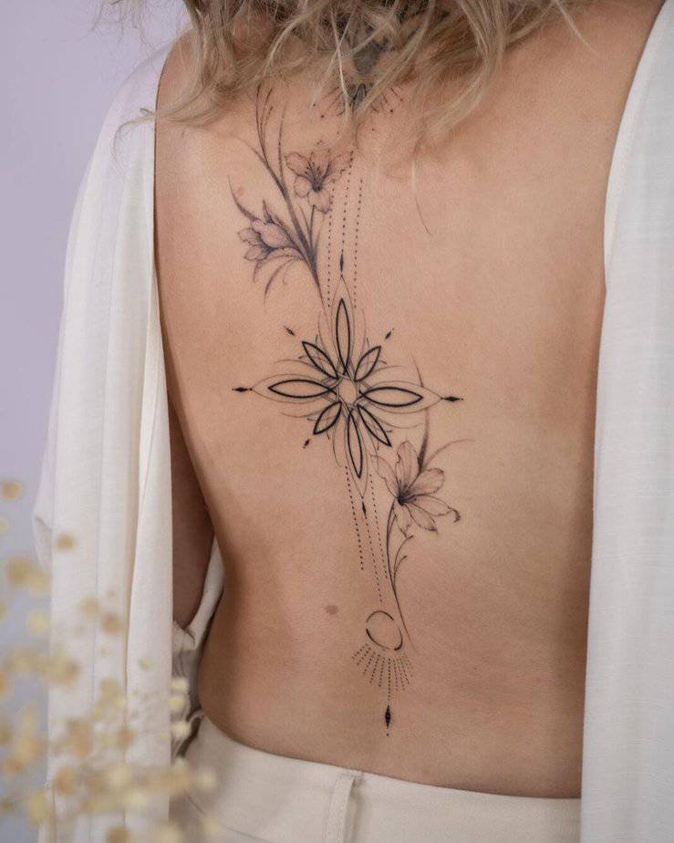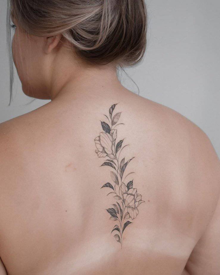 Okay, so the classic: a single vine running down the spine. It’s bold in its clean lines and then soft in the shaded leaves, like the perfect body accessory that doesn’t shout but definitely gets noticed. Vines don’t always have to be chunky — they can fold into flowers, little geometric bits, even a mandala tucked in the middle for a touch of unexpected detail. Sometimes they cascade from the shoulder and drape down the back in this flowy, almost ethereal way. And if you want something more delicate, go smaller-leafed along the spine so it reads like it’s blooming from you — feminine, understated, and leaves room for future tattoos if you’re into building a story over time.