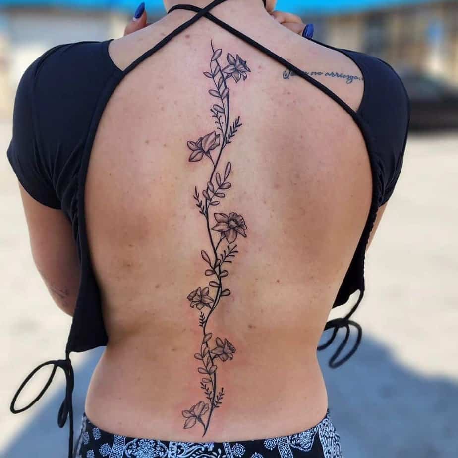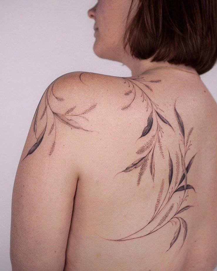 Not everyone wants a full-back commitment, and that’s perfect. Dainty vines with fine lines and dotted shading feel soft and very personal. They can start mid-back and climb up, or sit neatly on the shoulder blade like a petite accent. Sometimes the vine line is a little bolder while the leaves and tiny flowers are drawn with finer detail to keep the look delicate but readable. These small pieces still carry meaning without dominating your whole back.