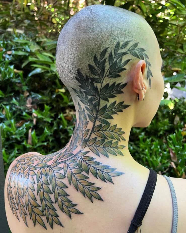 If you want to get creative, vines can do some wild things. A snake winding through the vine brings in protection and power; a mandala tucked into the center adds balance and a meditative feel (and blackout work can look stunning when placed thoughtfully). There are even designs where the vine wraps from the shoulder, across the back, and up toward the hairline with colored leaves that still read realistic. Thick lines, bold placements, mixed motifs — all of these choices make the vine feel unique to you, so don’t be afraid to get playful.