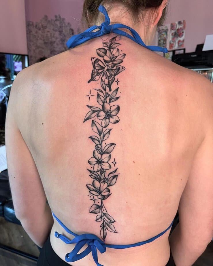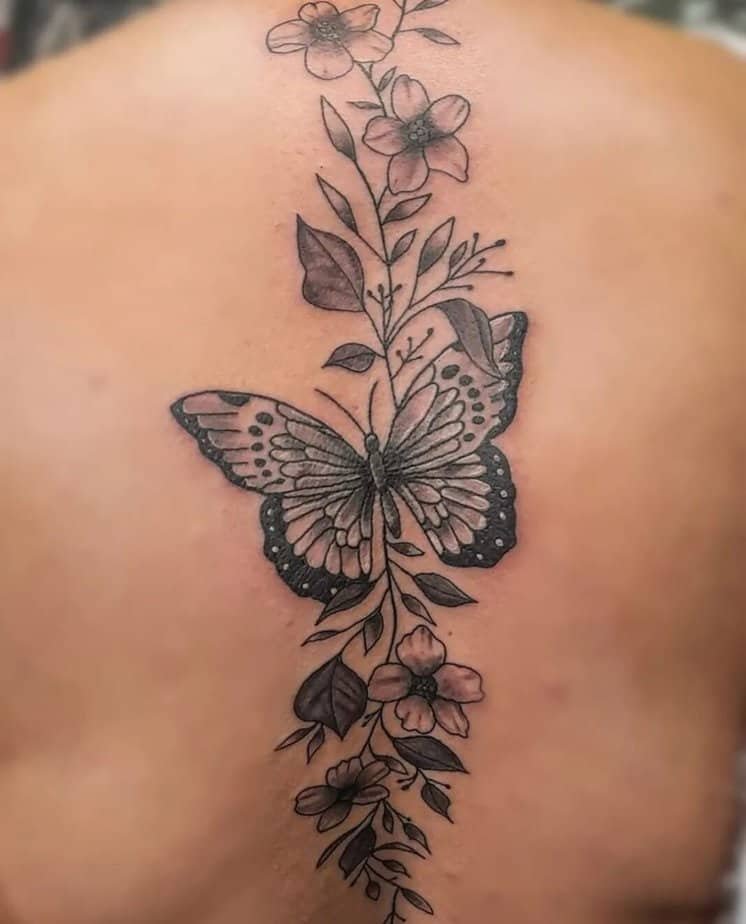 Butterflies bring in that symbolism of transformation and freedom, so pairing them with vines creates a little narrative on your skin: growth, movement, change. You can put a butterfly at the top as the focal point with vines and flowers trailing beneath, or tuck a butterfly in the middle so it looks like the vine grows out from behind it. If you don’t want a giant butterfly stealing the show, tiny ones scattered around the vine give you subtle motion — shading and white highlights can make them look like they’re catching the light as you move.