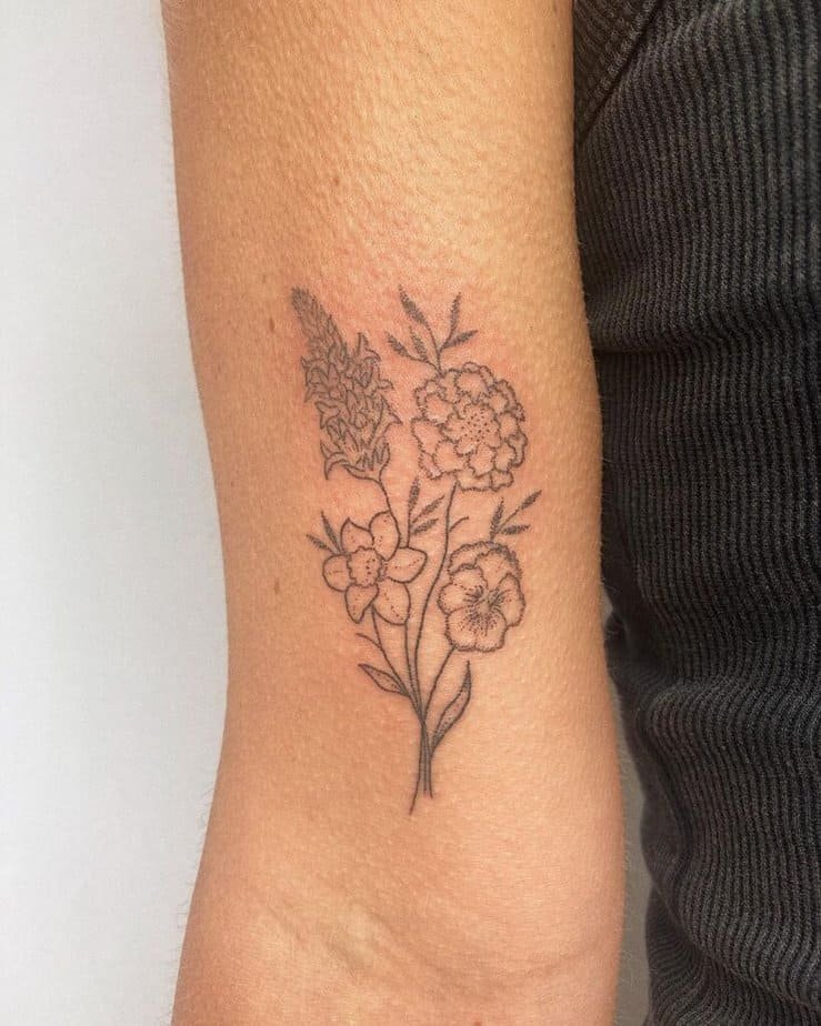 This one’s great if you want multiple flowers without the heaviness of bold ink. Fine-line bouquets feel airy and feminine, and they sit beautifully on arms, ribs, or behind the ear.
