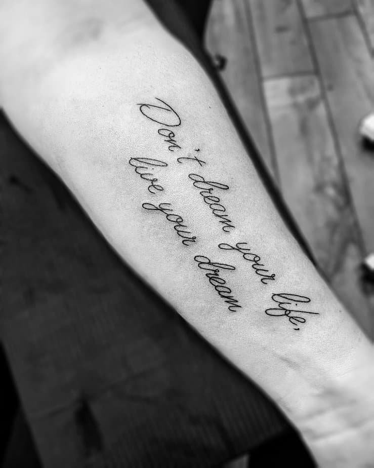 'Don’t dream your life, live your dream!' — this one’s basically permission to stop waiting and start doing. It’s the nudge that says stop imagining and start showing up, even if you’re terrified. If you want something to push you toward action every morning, a tattoo like this is like a tiny life coach on your arm.