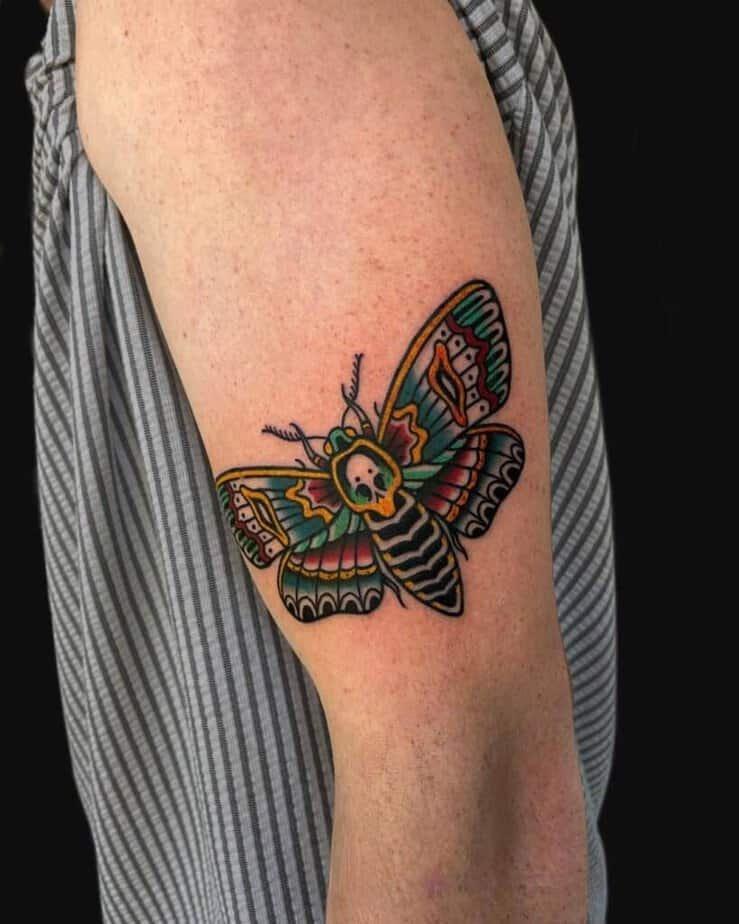 Traditional tattoos lean into strong outlines and rich colors. If you want something with that vintage tattoo energy, a moth in this style is a confident pick.