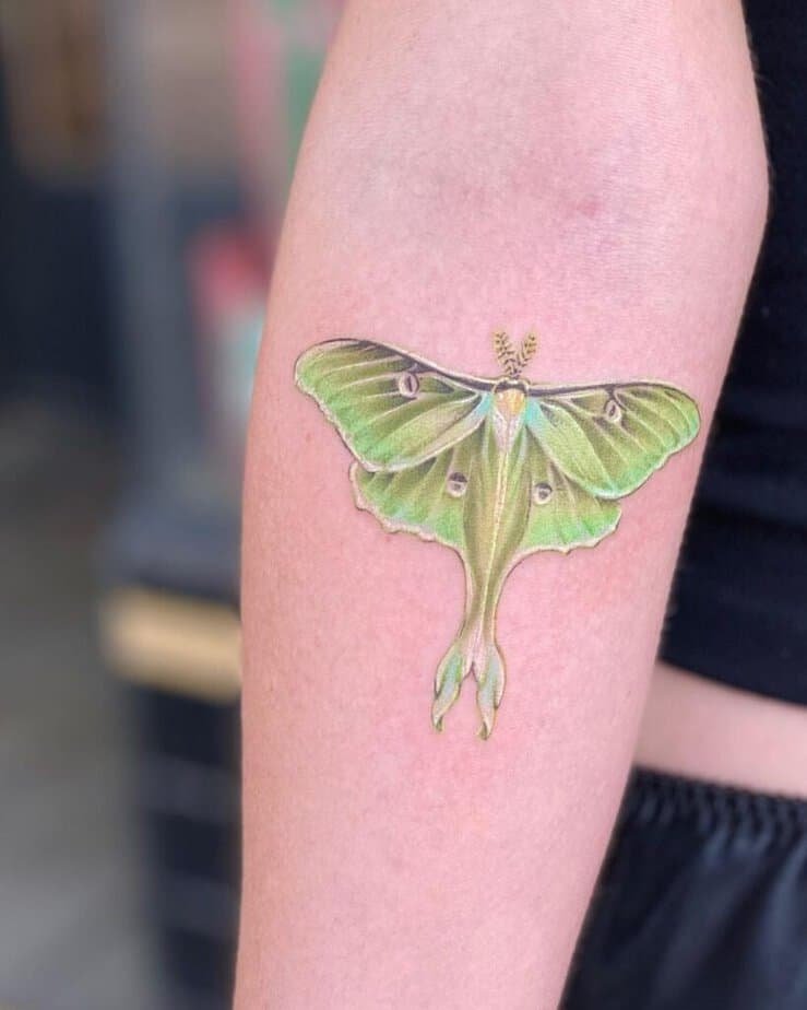 Luna moths are sculptural and stunning — those pale greens and elegant tails are made for a realistic tattoo style. If you want something that makes people stop and stare, this is it.